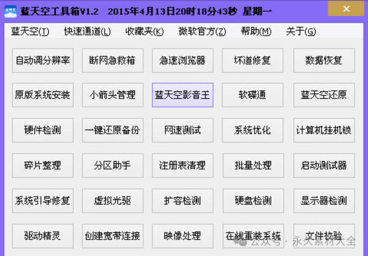 今日,大成要给大家介绍一款超实用的工具 ——“全能百宝工具箱” 即蓝天空工具箱。它专为广大计算机爱好者以及系统封装爱好者打造,无论是系统维护、修复,还是休闲娱乐,都能轻松应对。其功能极为强大,操作却十分简单,界面清爽宜人,便于携带,用来馈赠亲友也很合适。它整合了一百多项实用功能,能为封装的系统增添独特魅力。经众多朋友在 XP、win7 x32 等系统测试,启动该工具箱速度飞快,仅需 2 - 3 秒,而软件大小仅 95.4MB,在如此容量下还能有这般高效的运行速度,其出色程度可见一斑。