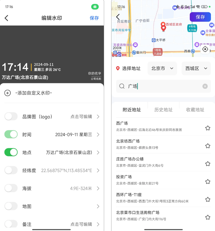 用户可以通过点击水印选项来编辑logo、时间、地点和备注等多样化的水印信息。地理位置可通过直接搜索所需的地址来定位,保存后即可使用。