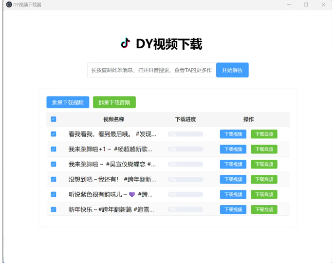 然后粘贴到软件中解析,解析后可以全选,然后【批量下载视频】和【批量下载音频】。