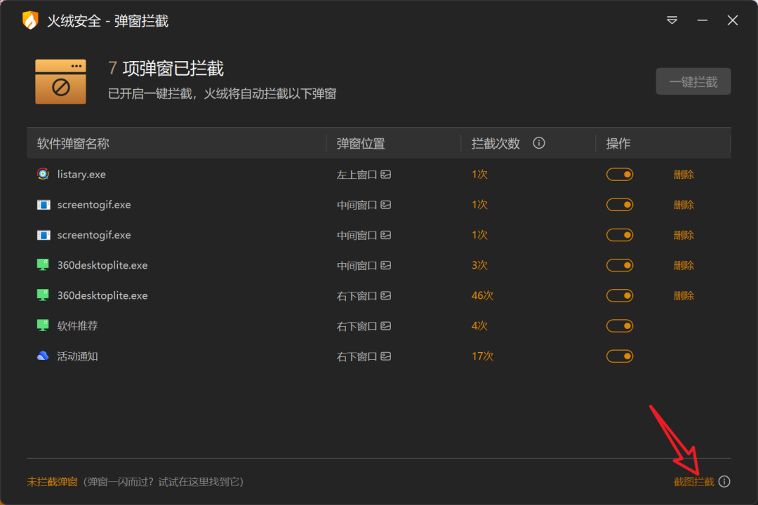 然后点“截图拦截”